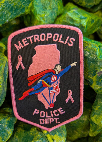 Show your support for breast cancer awareness with the Limited Edition Metropolis Illinois Police Patch. Showing the Metropolis Illinois police badge design with a pink ribbon, this is the perfect way to both honor the police department and contribute to the fight against breast cancer.